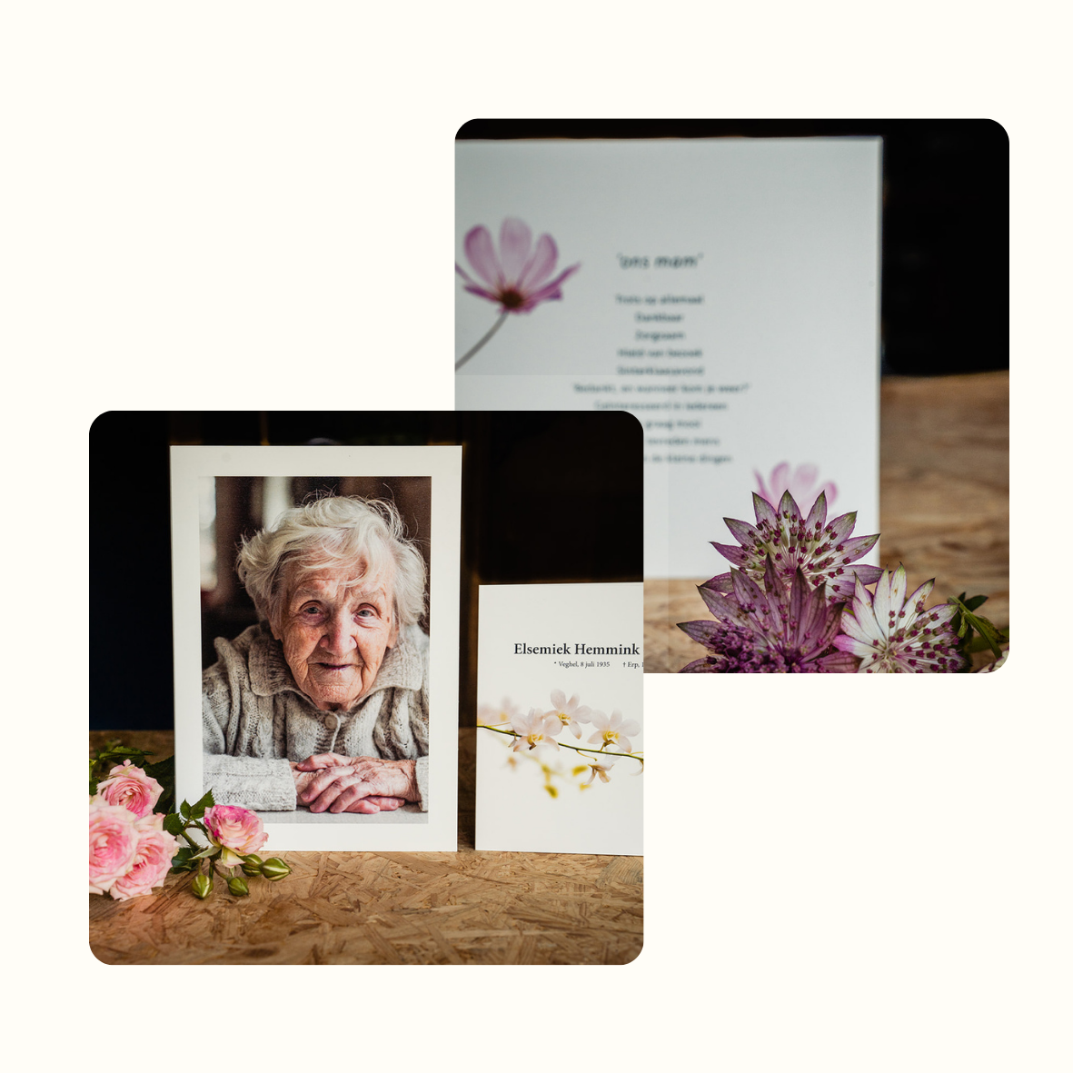 Bij Mariska van Vliet Uitvaartzorg ontwerpen we al het rouwdrukwerk zelf. We vinden het belangrijk dat elke kaart recht doet aan de persoon die is overleden. Daarom stemmen we zowel tekst als beeld volledig af op de overledene en zijn of haar verhaal.